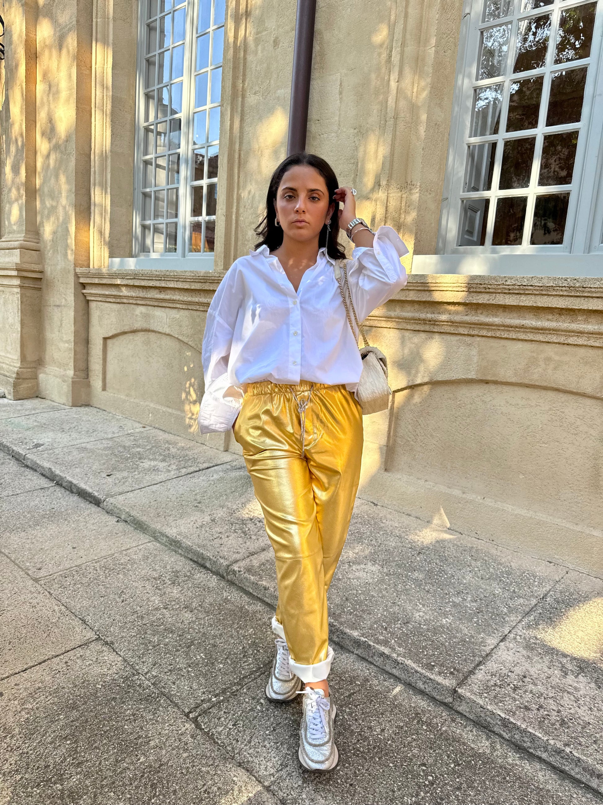 Pantalon métallisé avec taille élastique et poche latérale, allie confort et style parfait pour un look audacieux, tendance.